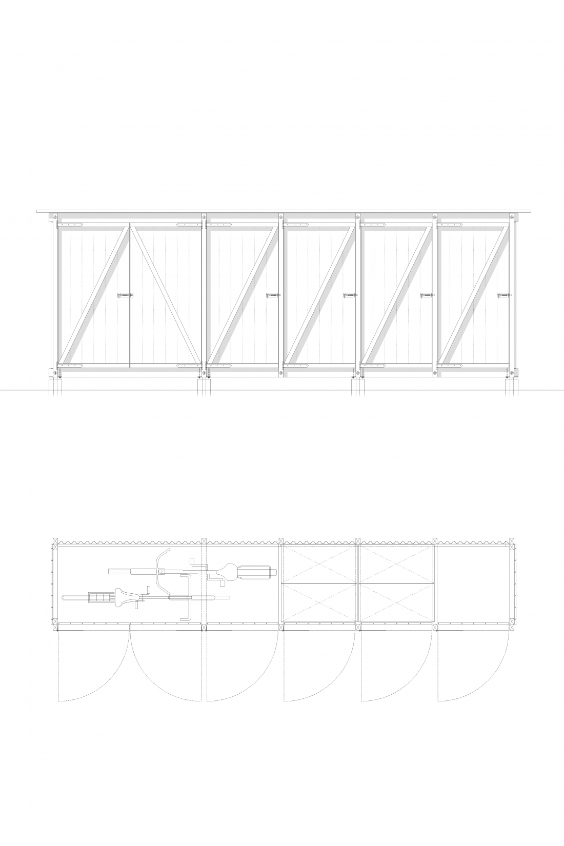 Einem Regal gleich, ist der Schuppen nicht begehbar und kann über Drehtüren beschickt werden.