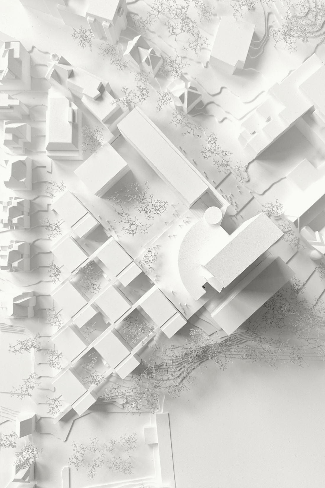 Ein Gebäudeensemble aus geometrisch unterschiedlichen, in der Höhe gestaffelten Baukörpern bettet den Kreishaussolitär in die bautypologisch heterogene, topographisch komplexe Umgebung ein. Dem Gebäudeensemble liegt eine einfache, zweidimensionale Grundrissmatrix zugrunde, die sich an der Moltkestraße und dem orthogonal zu dieser angeordneten Hochhausscheibe des Kreishauses ausrichtet. Diese Ordnungsstruktur bildet die geometrische DNA des Entwurfes, aus der sich die Sequenz von Baukörpern, öffentlichen Plätzen und privaten Höfen in die Tiefe des Kreishausareals bis zum tiefsten Geländepunkt an der Lochwiese entwickelt. Die programmatische Anordnung der Nutzungseinheiten entspricht dieser logischen Abfolge und staffelt die hochfrequentierten Publikumsbereiche von der Moltkestraße mit abnehmender Nutzungsfrequenz in die Tiefe des Kreishausareals hinein. Dabei entsteht die für das gesamte Kreishausgelände charakteristische räumliche Vielfalt und Maßstäblichkeit. Sie macht die Vielfalt möglicher Nutzungsmodelle und Nutzerstrukturen ablesbar.